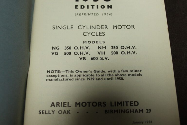 Ariel 1939 singles motorcycle owner’s guide 250cc OG OH 350cc NG NH 500cc/600cc VA VB VG VH